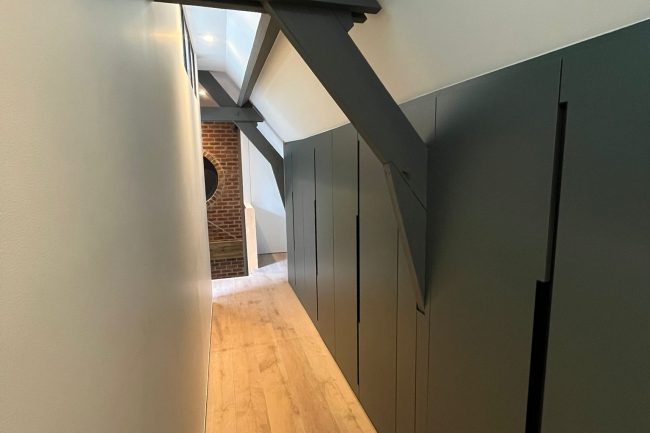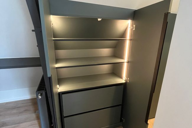 Magnifique placard sous pente, entièrement conçu sur-mesure pour transformer un espace inutilisé en solution de rangement élégante et fonctionnelle. Voyez la transformation : de l'optimisation de l'espace aux détails intérieurs avec éclairage intégré, chaque élément a été pensé. Fini les espaces perdus ! Que vous ayez des combles ou un espace atypique, nous créons l'agencement qui vous ressemble.